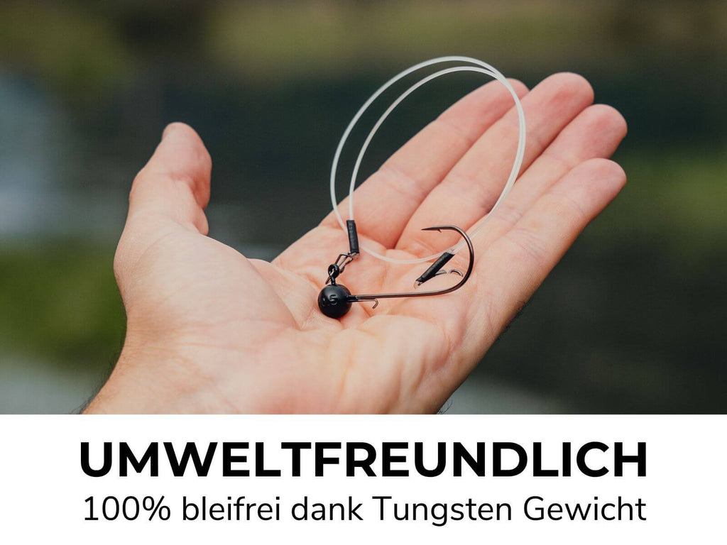Der Jig Head kann mit dem Snap des Vorfachs eingehakt werden, um direkt loszulegen. Einfach mit der Hauptschnur verbinden und los geht's. Der Haken ist extra gehärtet, ultra scharf und robust. Zudem wurde abriebfestes Fluorocarbon sowie ein schnell sinkendes und umweltfreundliches Tungsten Weight verwendet. Jedes Stück ist handgefertigt, um hochwertige Verbindungen sicherzustellen.