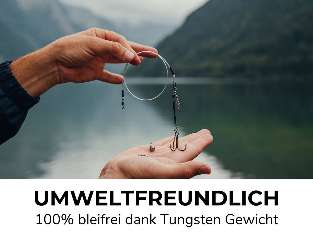 Wie bei allen JAEGER Produkten, haben wir beim Shallow Rig Set darauf geachtet, alle Materialien möglichst umweltfreundlich zu gestalten. Mit den Tungsten Gewichten und den gehärteten Stahl Haken, bietet das Shallow Rig Set höchste Performance bei gleichzeitiger Umweltfreundlichkeit. Deinem Abenteuer steht nichts mehr im Weg.