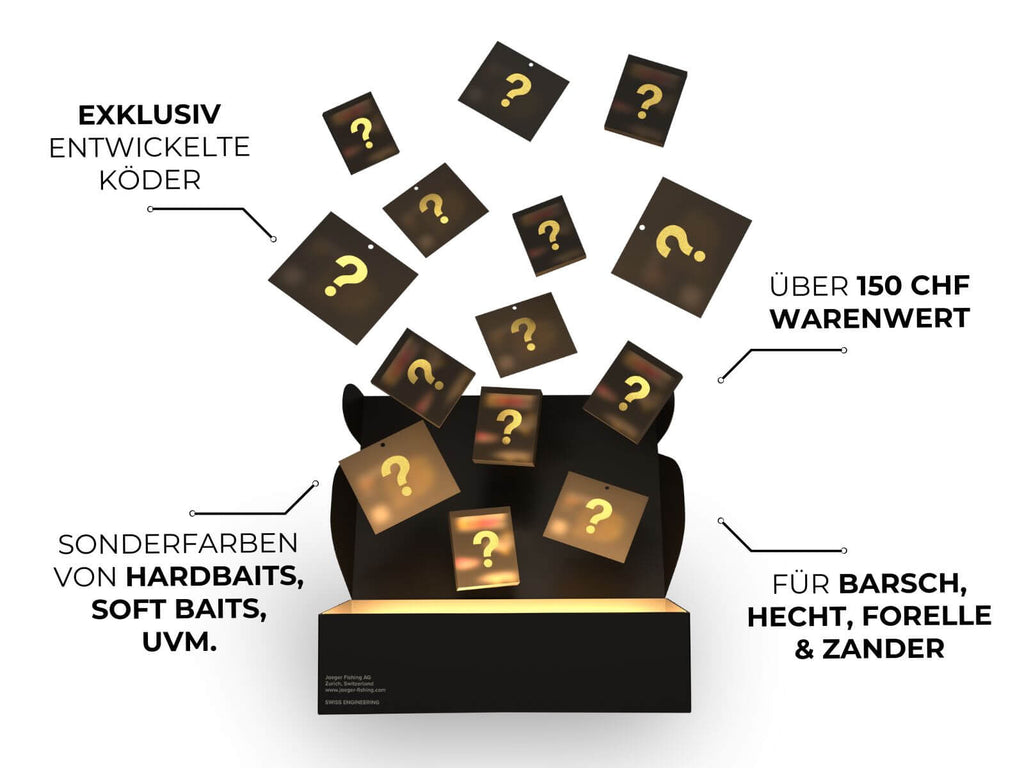 Mit über 150 CHF Warenwert bietet die Box alles, was man für ein gelungenes Angeljahr braucht – von exklusiven Ködern bis hin zu praktischen Accessoires. Alles ist abgestimmt auf die vier beliebtesten Zielfische: Barsch, Hecht, Forelle und Zander.